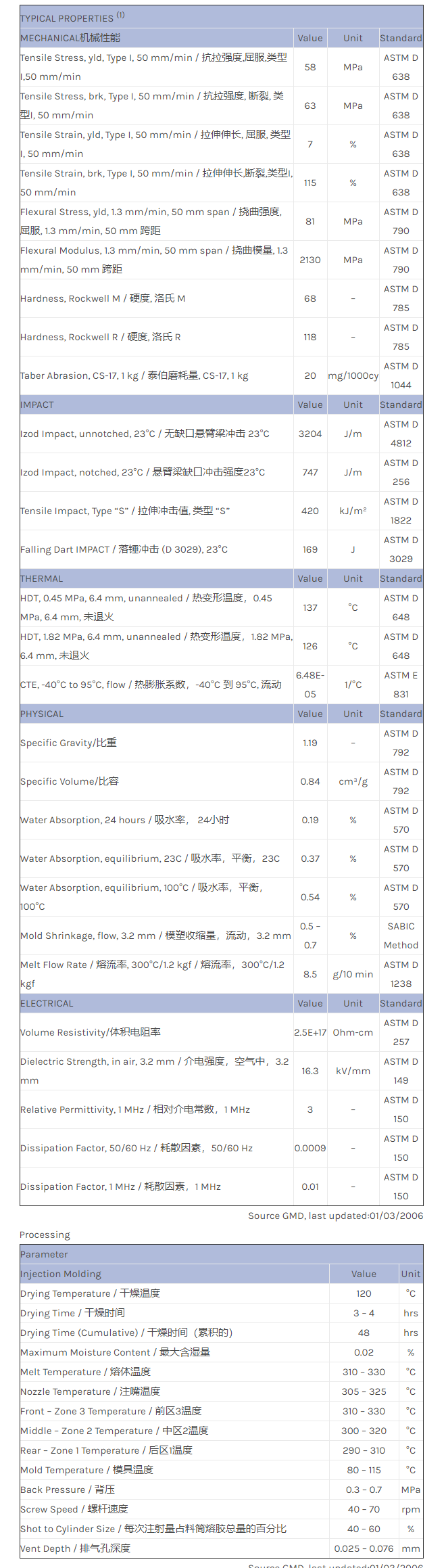 应用范围: 产品描述 LEXAN PC 194物性表 非卤化物。熔体流动速率MFR:8.5。高抗冲击性。厚壁制件。符合FDA规范(有颜色限制)。仅有不透明色。