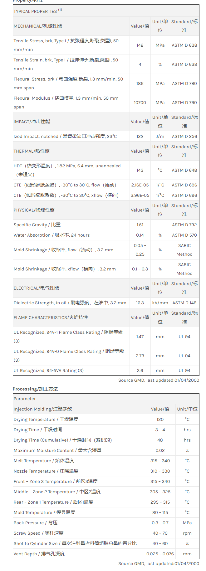 “Lexan LGK5030 resin是一种聚碳酸酯(PC)材料,含有的填充物为玻璃纤维增强材料。加工方式为:注射成型。