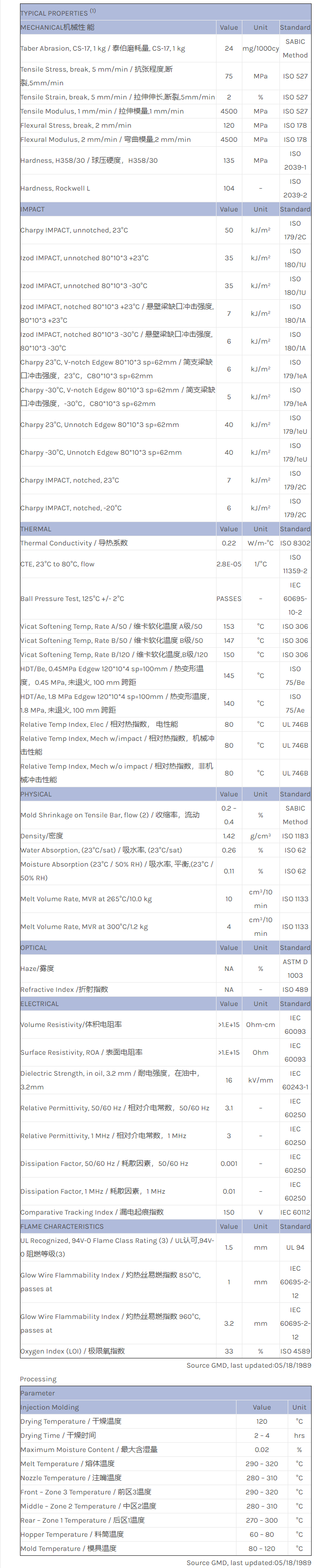 应用范围: 产品描述 LEXAN PC ML3513物性表 LEXAN ML3513 is a high viscosity, 30% short fibre glass reinforced, flame retardant grade, especially designed for connectors and relay separators.