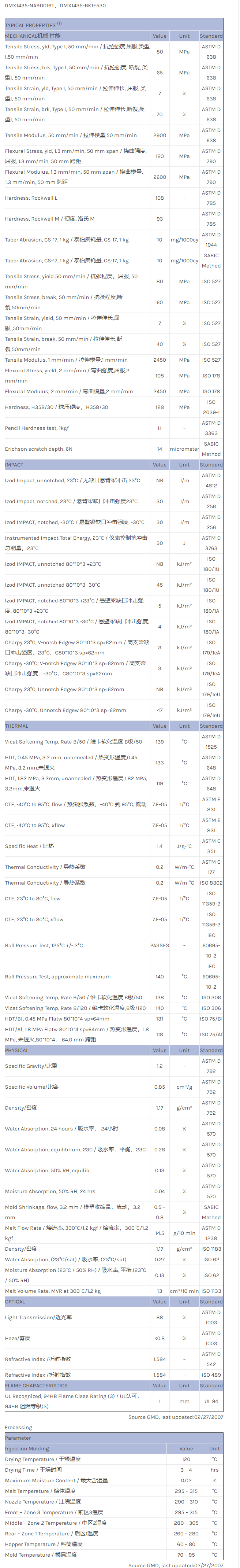 应用范围: 产品描述 LEXAN PC DMX1435物性表 Lexan* DMX1435 is a UV stabilized standard flow polycarbonate copolymer resin with improved scratch resistance. 相关色号:DMX1435-GY6E563T、DMX1435-GY4D440T、DMX1435-NA9D016TSGD