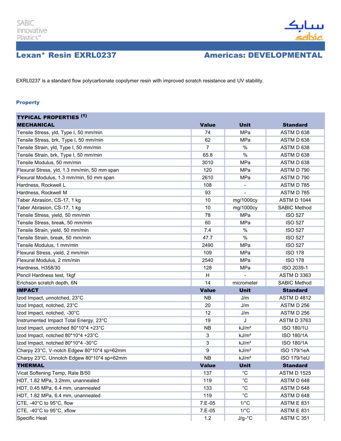 EXRL0237 is a standard flow polycarbonate copolymer resin with improved scratch resistance and UV stability.