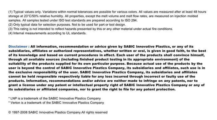 应用范围:产品描述LNP VERTON MV007SUP物性表LNP VERTON MV007SUP是一种聚丙烯材料,含有的填充物为长玻璃纤维,加工方式为:注射成型。LNP VERTON MV007SUP的主要特性有:阻燃/额定火焰通过ROHS认证化学耦合热稳定