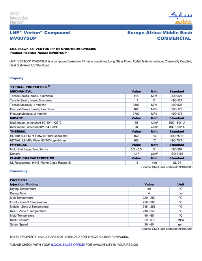 肇庆LNP VERTON MV007SUP是一种聚丙烯材料,含有的填充物为长玻璃纤维,加工方式为:注射成型。
