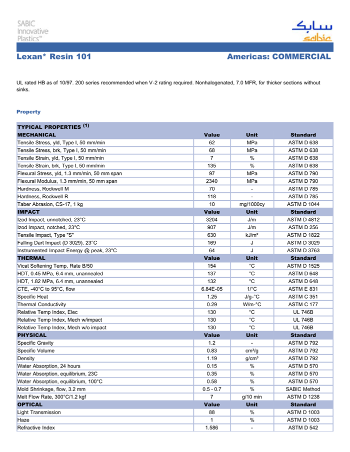 应用范围:产品描述Lexan PC 101物性表非卤化。熔体流动速率MFR:7.0。注塑厚壁型材时,无凹陷缺陷。相关颜色色号:101-111UL rated HB as of 10/97. 200 series recommended when V-2 rating required. Nonhalogenated. 7.0 MFR, for thicker sections without sinks.
