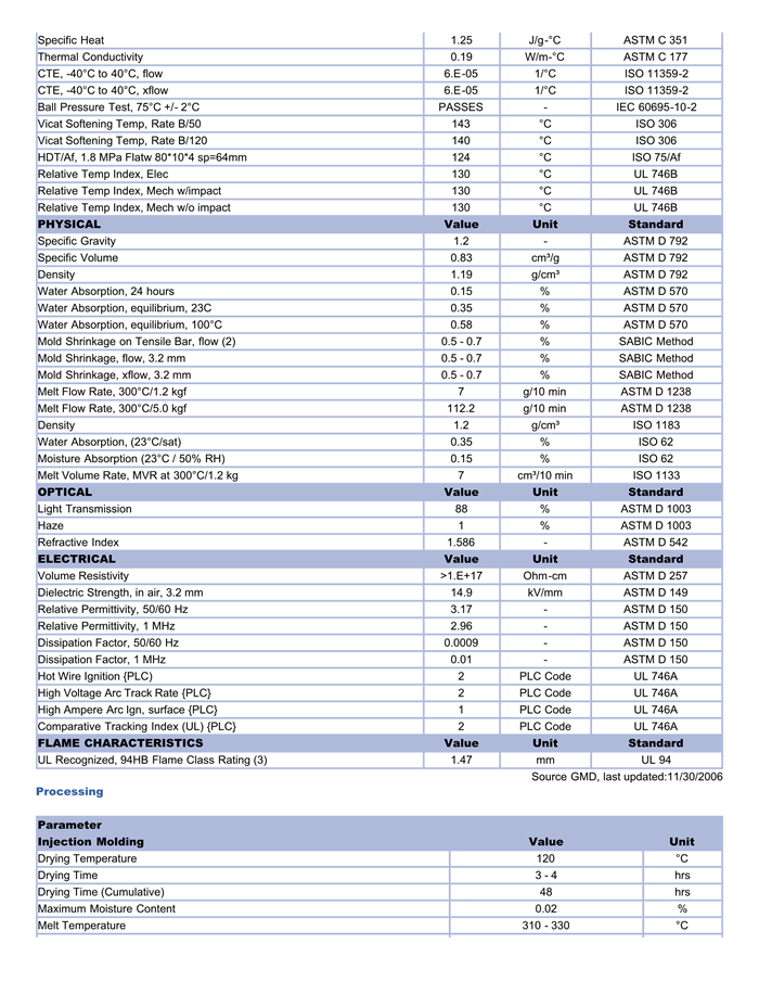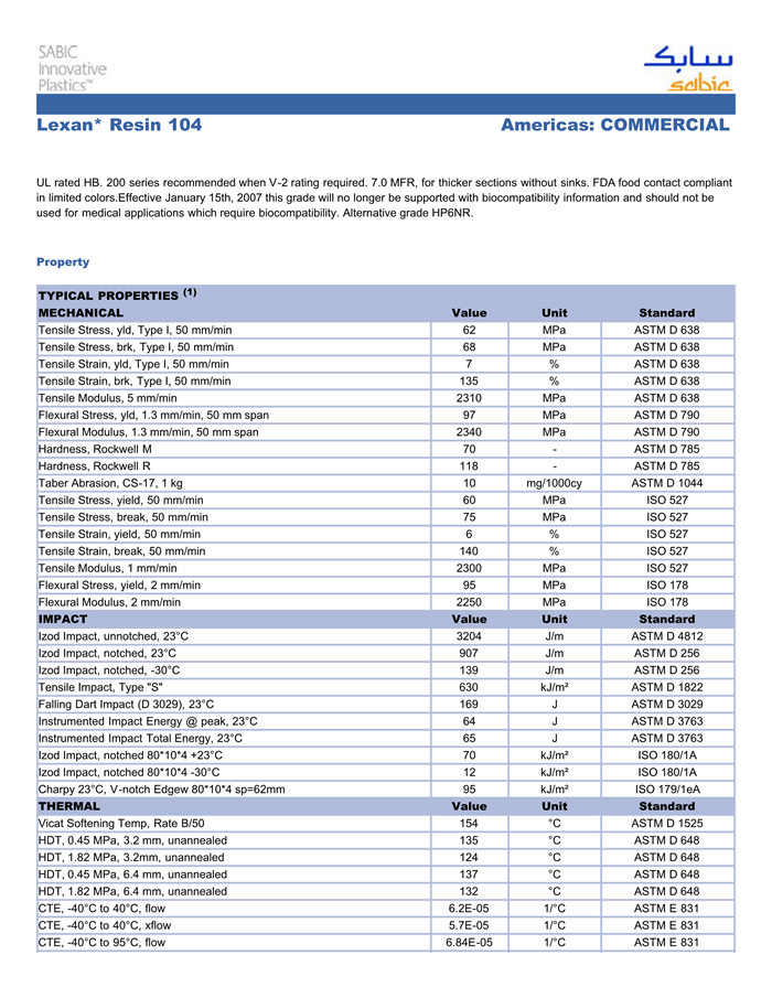 应用范围:产品描述Lexan PC 104物性表非卤化。熔体流动速率MFR:7.0。注塑厚壁型材时,无凹陷缺陷。符合FDA 标准 (有颜色限制)。相关颜色色号:104-111NUL rated HB. 200 series recommended when V-2 rating required. 7.0 MFR, for thicker sections without sinks. FDA food c