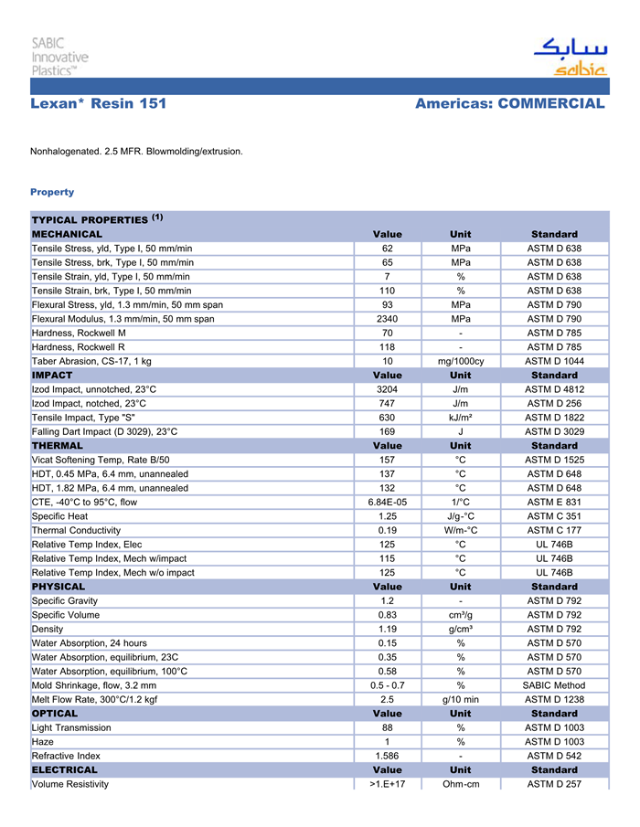 LEXAN PC 151物性表