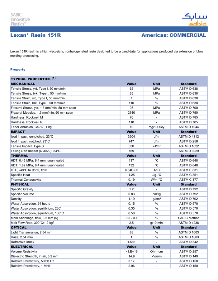 Lexan 151R resin is a high viscosicty, nonhalogenated resin designed to be a candidate for applications produced via extrusion or blow molding processing.