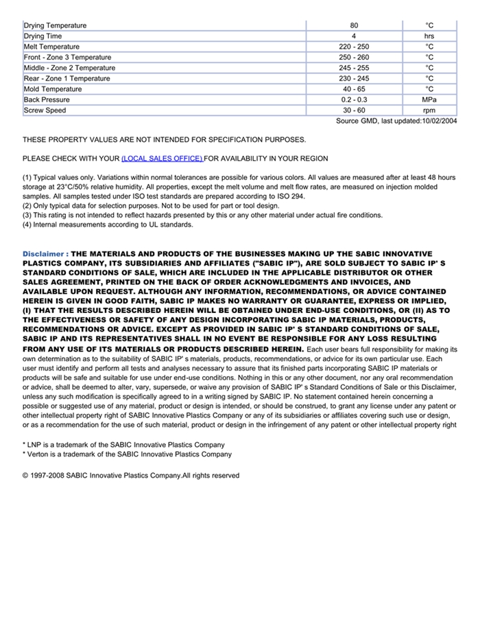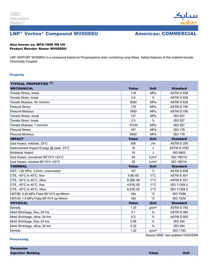 应用范围:产品描述LNP VERTON MV008SU物性表LNP VERTON MV008SU是一种聚丙烯材料,含有的填充物为长玻璃纤维,加工方式为:注射成型。LNP VERTON MV008SU的主要特性为:化学耦合。