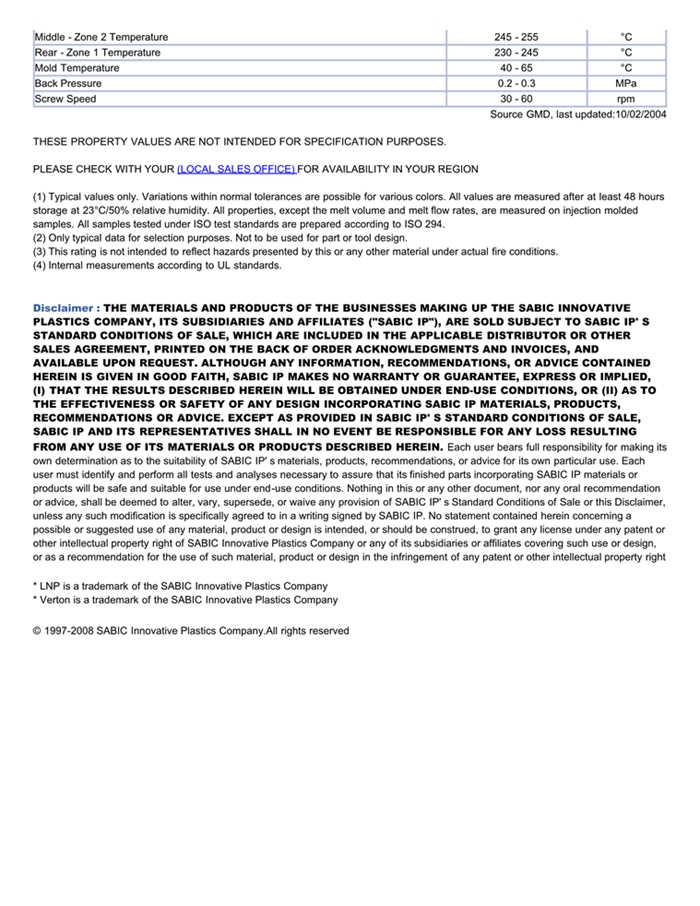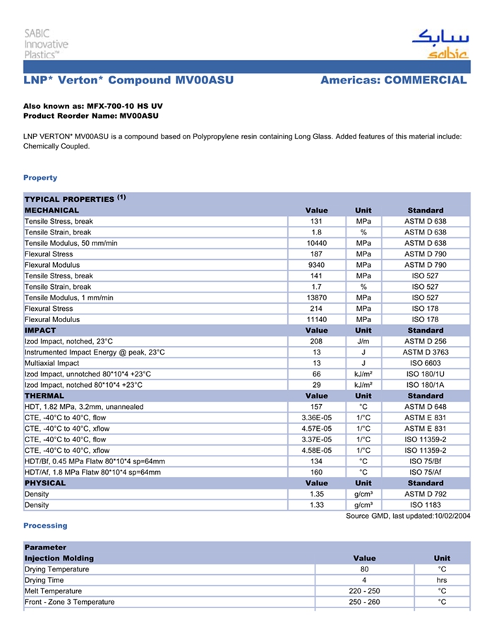 肇庆LNP VERTON MV00ASU是一种聚丙烯材料,含有的填充物为长玻璃纤维,加工方式为:注射成型。