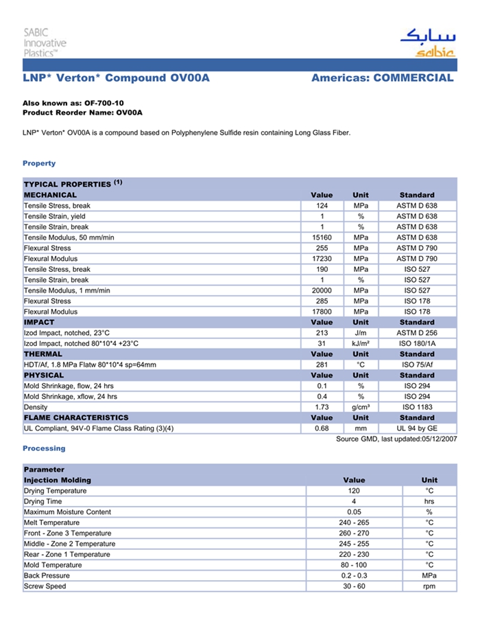 LNP* Verton* OV00A is a compound based on Polyphenylene Sulfide resin containing Long Glass Fiber.