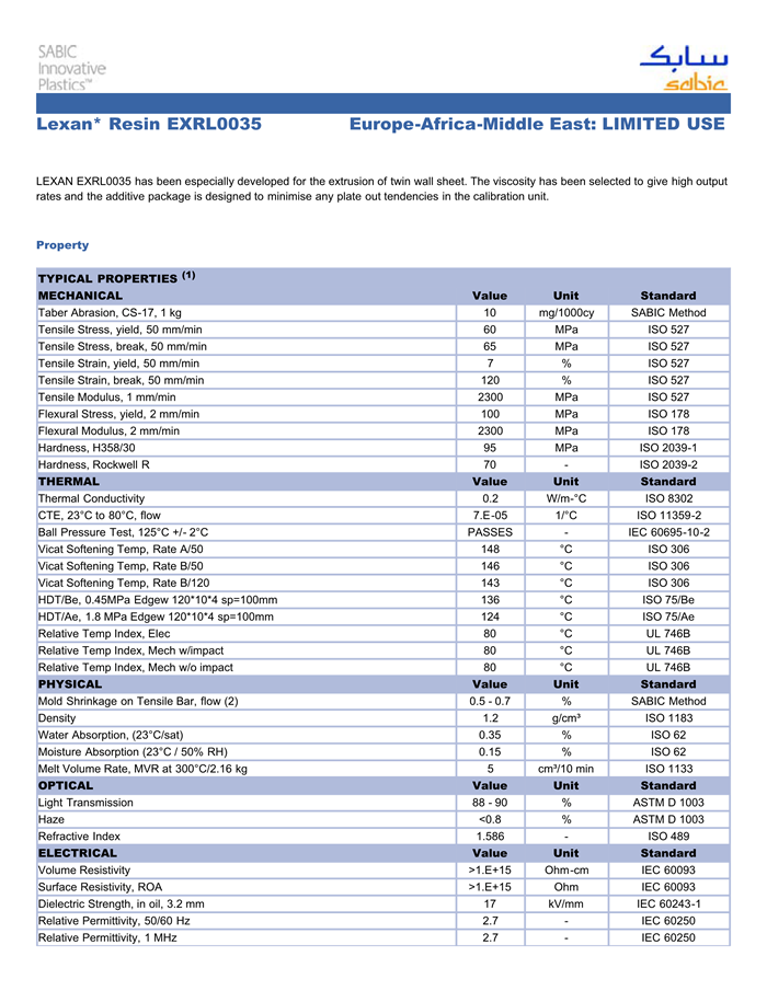 应用范围:产品描述LEXAN PC EXRL0035物性表LEXAN EXRL0035 has been especially developed for the extrusion of twin wall sheet. The viscosity has been selected to give high output rates and the additive package is designe