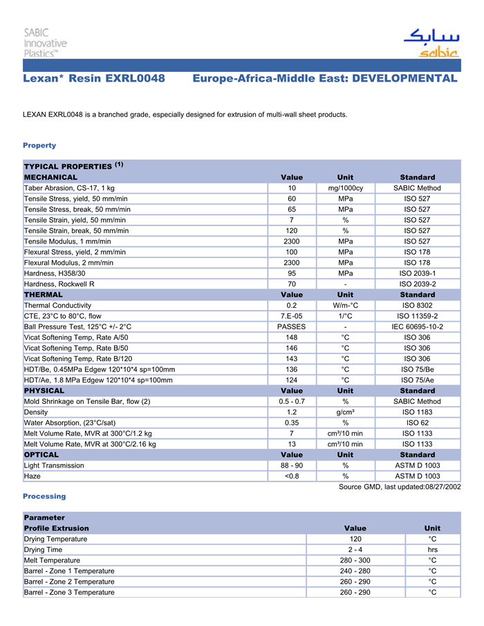 应用范围:产品描述LEXAN PC EXRL0048物性表LEXAN EXRL0048 is a branched grade, especially designed for extrusion of multi-wall sheet products.