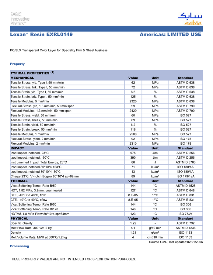 应用范围:产品描述LEXAN PC EXRL0149物性表PC/SLX Transparent Color Layer for Speciality Film & Sheet business.