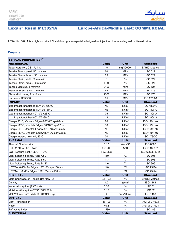 LEXAN ML3021A is a high viscosity, UV stabilised grade especially designed for injection blow moulding and profile extrusion.