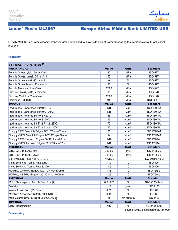 应用范围:产品描述LEXAN PC ML3967物性表LEXAN ML3967 is a lower viscosity branched grade developed to allow extrusion at lower processing temperatures of multi-wall sheet products.