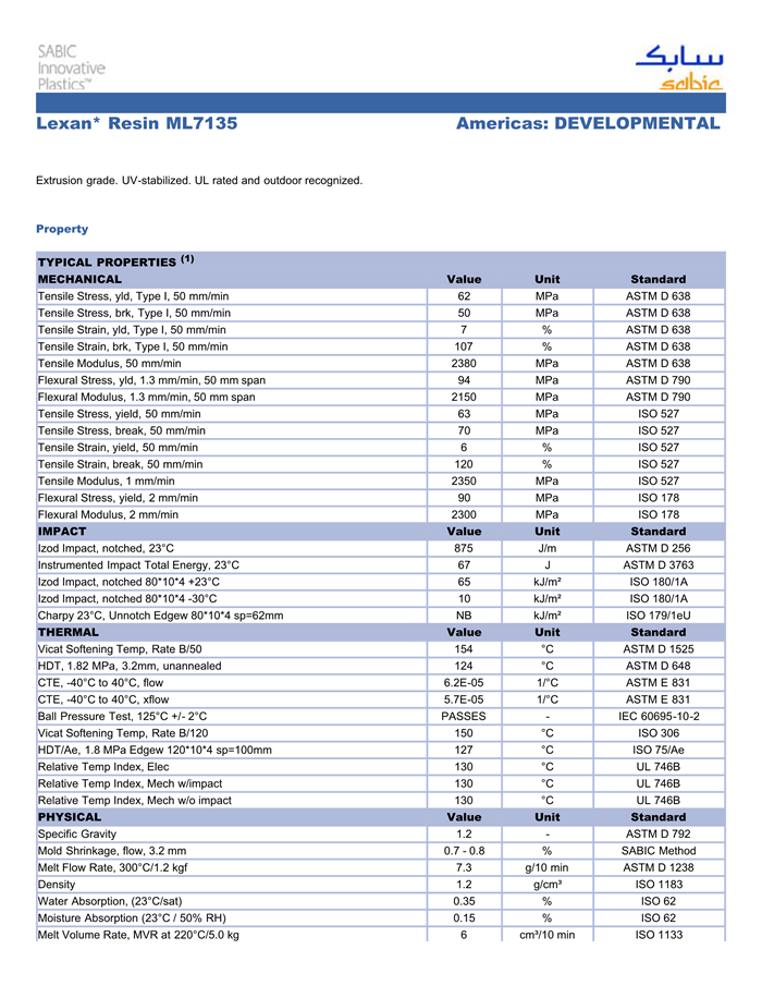 应用范围:产品描述LEXAN PC ML7135物性表Extrusion grade. UV-stabilized. UL rated and outdoor recognized.