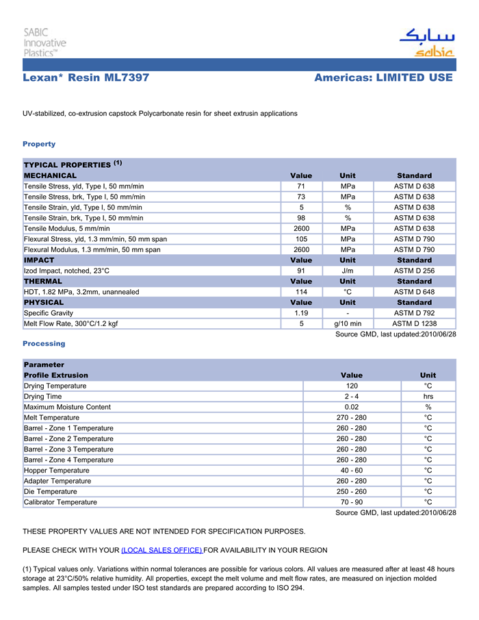 应用范围:产品描述LEXAN PC ML7397物性表UV-stabilized, co-extrusion capstock Polycarbonate resin for sheet extrusin applications