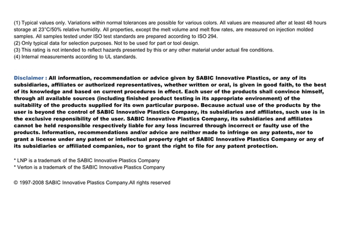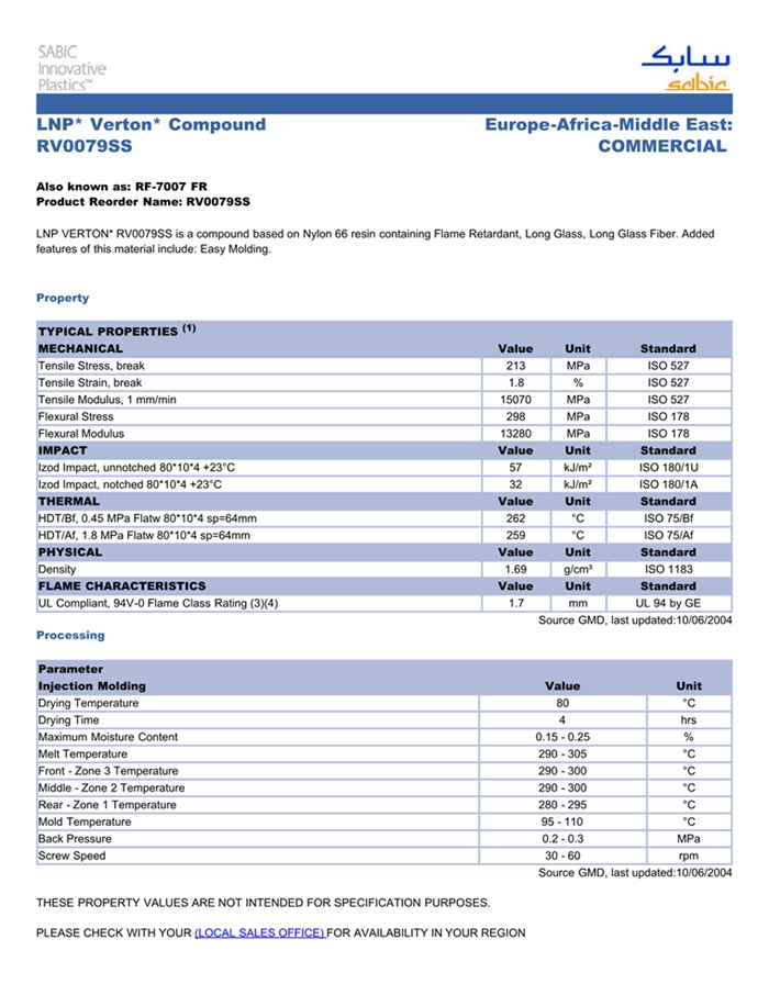 应用范围:产品描述LNP VERTON RV0079SS物性表LNP VERTON* RV0079SS is a compound based on Nylon 66 resin containing Flame Retardant, Long Glass, Long Glass Fiber. Added features of this material include: Easy Molding.