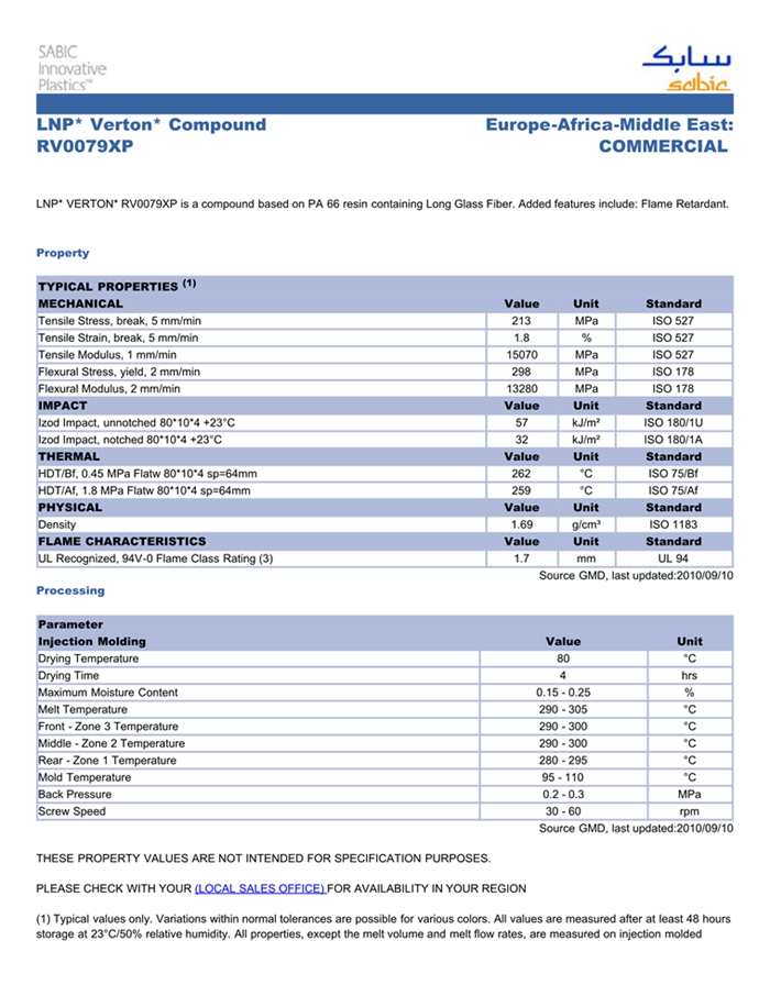 LNP* VERTON* RV0079XP is a compound based on PA 66 resin containing Long Glass Fiber. Added features include: Flame Retardant