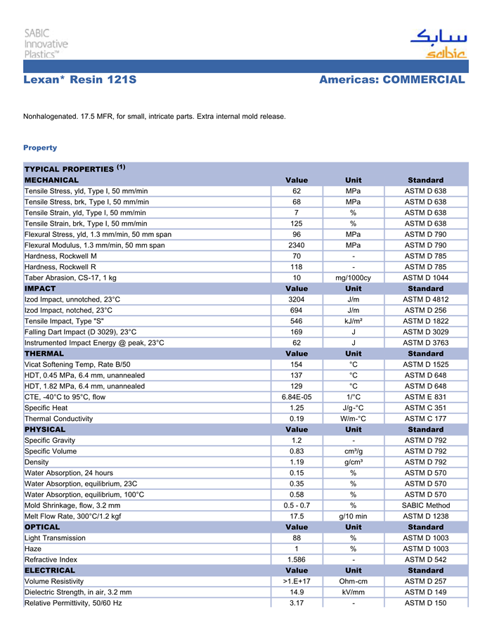 应用范围:产品描述LEXAN PC 121S物性表Nonhalogenated. 17.5 MFR, for small, intricate parts. Extra internal mold release.