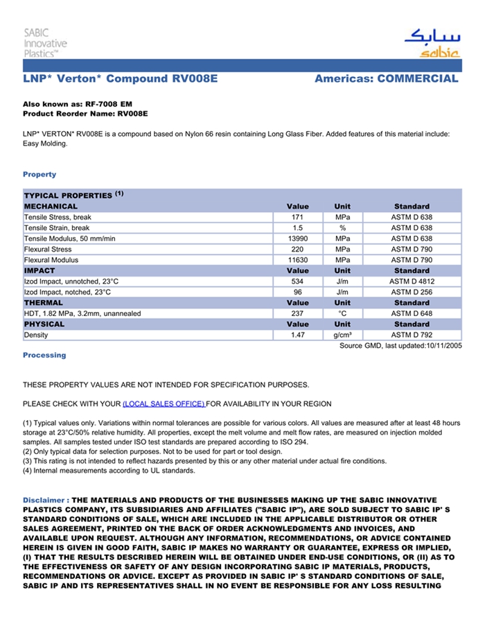 应用范围: 产品描述 LNP Verton RV008E物性表 “LNP VERTON RV008E是一种聚酰胺66(尼龙66)材料,含有的填充物为长玻璃纤维。 LNP VERTON RV008E的主要特性为:加工性能良好。” LNP* VERTON* RV008E is a compound based on Nylon 66 resin containing Long Glass Fiber.