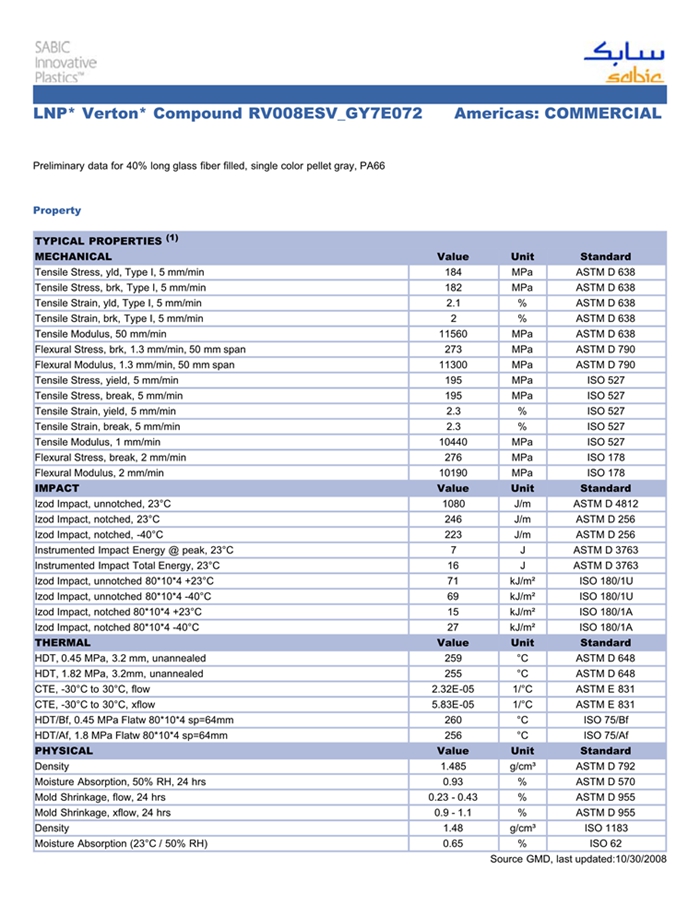 应用范围:产品描述LNP VERTON RV008ESV_GY7E072物性表Preliminary data for 40% long glass fiber filled, single color pellet gray, PA66