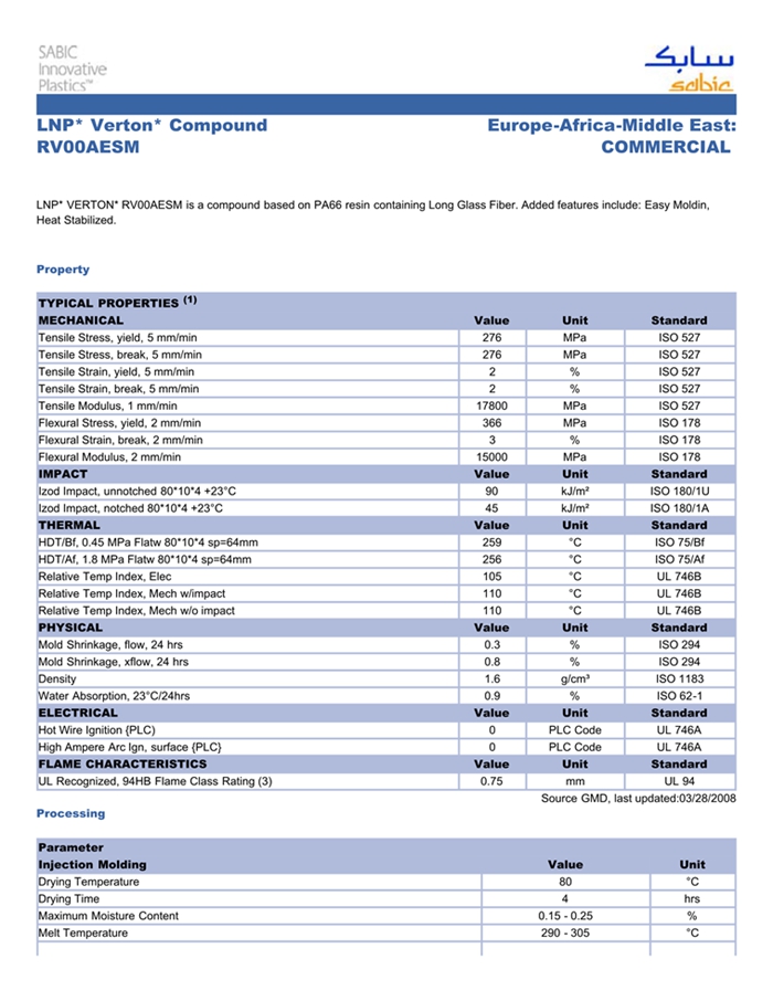 LNP* VERTON* RV00AESM is a compound based on PA66 resin containing Long Glass Fiber. Added features include: Easy Moldin, Heat Stabilized.