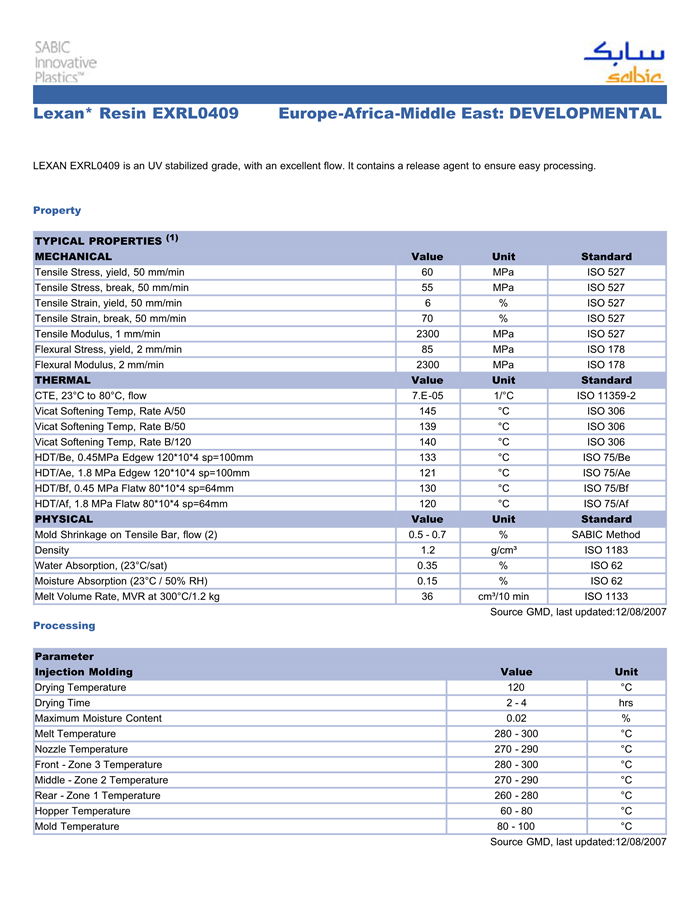 LEXAN EXRL0409 is an UV stabilized grade, with an excellent flow. It contains a release agent to ensure easy processing.
