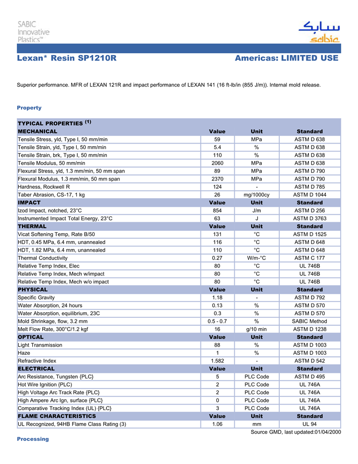 相关标签:Lexan PC 易加工,LEXAN PC SP1210R,