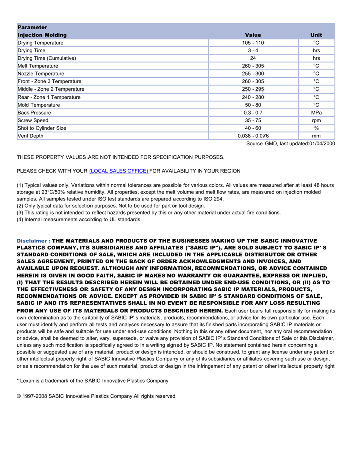 优异的性能。与Lexan 121R有相同的熔体流动速率MFR,抗冲击性能与 Lexan 141相同(16 ft-lb/in (855 J/m))。内含脱模剂。