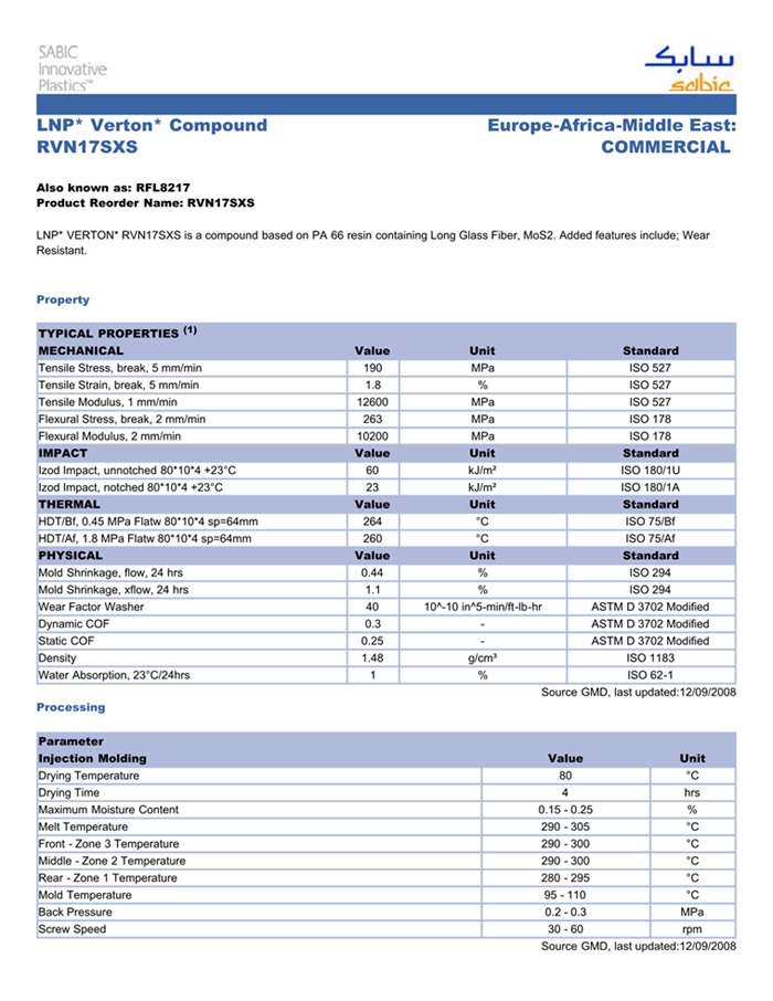应用范围:产品描述LNP VERTON RVN17SXS物性表LNP* VERTON* RVN17SXS is a compound based on PA 66 resin containing Long Glass Fiber, MoS2. Added features include; Wear Resistant.