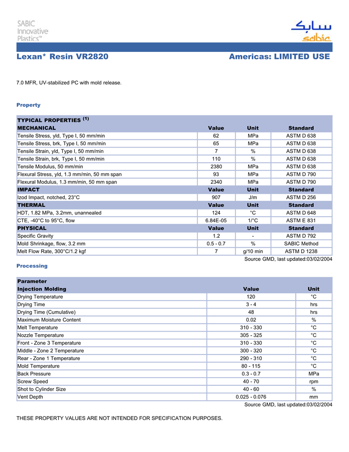 应用范围:产品描述LEXAN PC VR2820物性表Lexan VR2820 resin是一种聚碳酸酯(PC)产品,它可以通过注射成型进行加工。特性包括:良好的抗紫外线能力脱模剂紫外线稳定