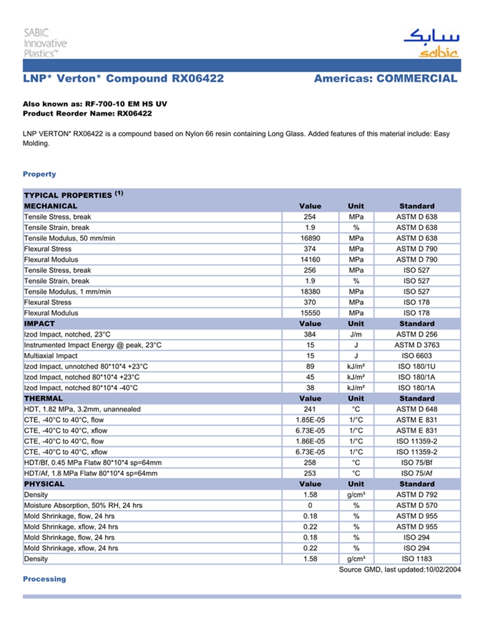 肇庆LNP VERTON* RX06422 is a compound based on Nylon 66 resin containing Long Glass. Added features of this material include: Easy Molding.