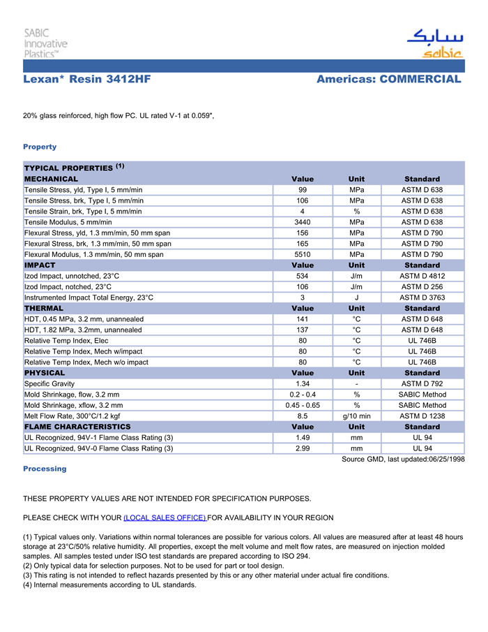 “Lexan 3412HF resin是一种聚碳酸酯(PC) 以20%玻璃纤维增强材料填充的产品。
