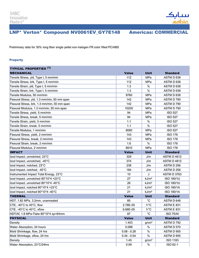 应用范围: 产品描述 LNP VERTON NV0061EV_GY7E148物性表 Preliminary data for 30% long fiber single pellet non-halogen FR color filled PC/ABS