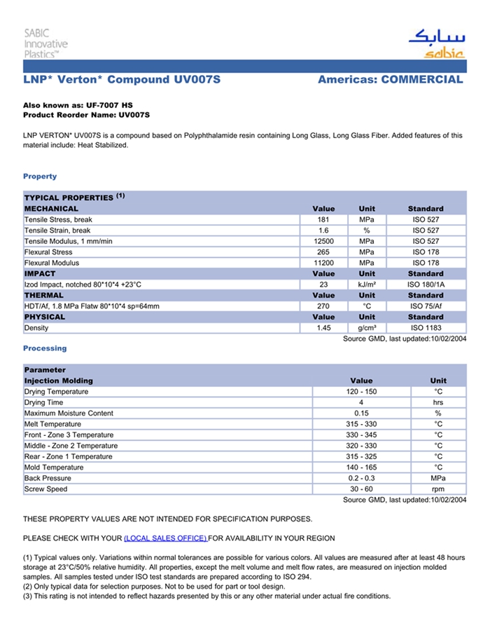应用范围: 产品描述 LNP VERTON UV007S物性表 LNP VERTON* UV007S is a compound based on Polyphthalamide resin containing Long Glass, Long Glass Fiber. Added features of this material include: Heat Stabilized.