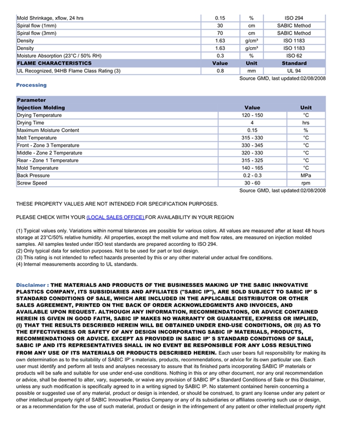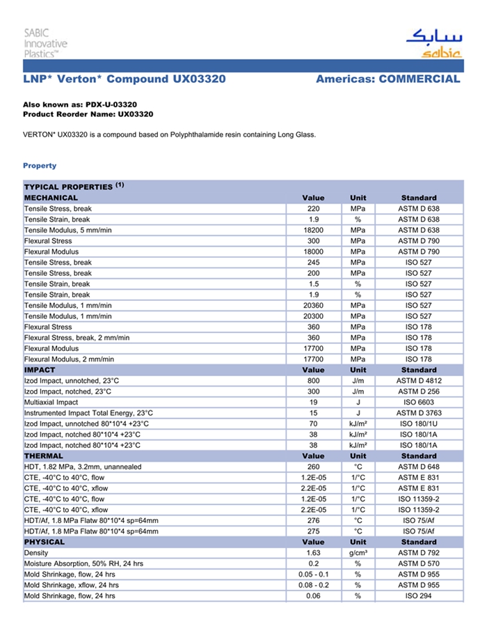 应用范围: 产品描述 LNP Verton UX03320物性表 “LNP VERTON UX03320是一种聚二甲苯酰胺(PPA)材料,含有的填充物为长玻璃纤维,加工方式为:注射成型。 LNP VERTON UX03320的主要特性为:阻燃/额定火焰。” VERTON* UX03320 is a compound based on Polyphthalamide resin containing