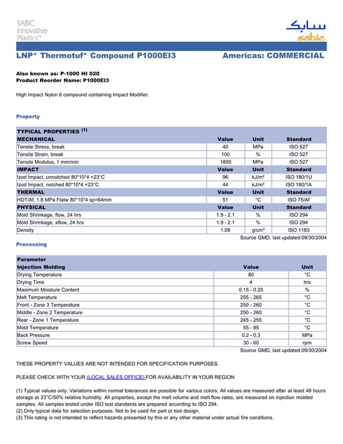 应用范围:产品描述LNP THERMOTUF P1000EI3物性表High Impact Nylon 6 compound containing Impact Modifier.
