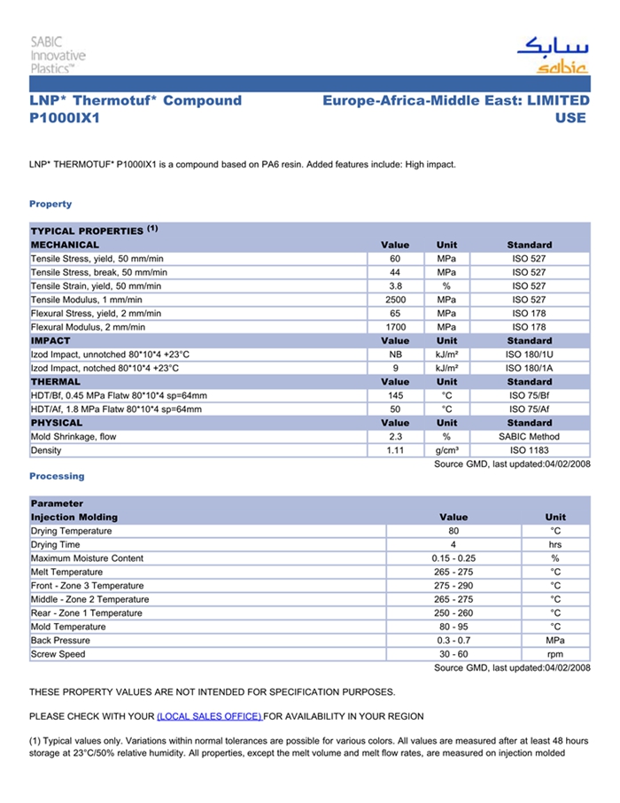 LNP* THERMOTUF* P1000IX1 is a compound based on PA6 resin. Added features include: High impact.