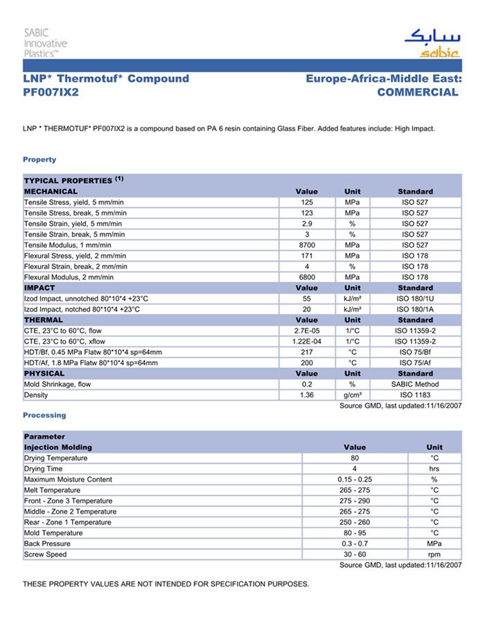 应用范围: 产品描述 LNP THERMOTUF PF007IX2物性表 LNP * THERMOTUF* PF007IX2 is a compound based on PA 6 resin containing Glass Fiber. Added features include: High Impact.