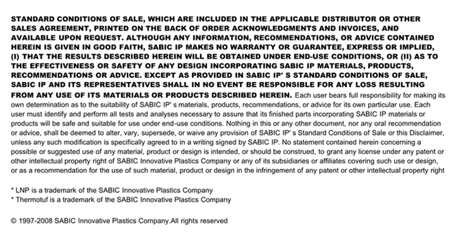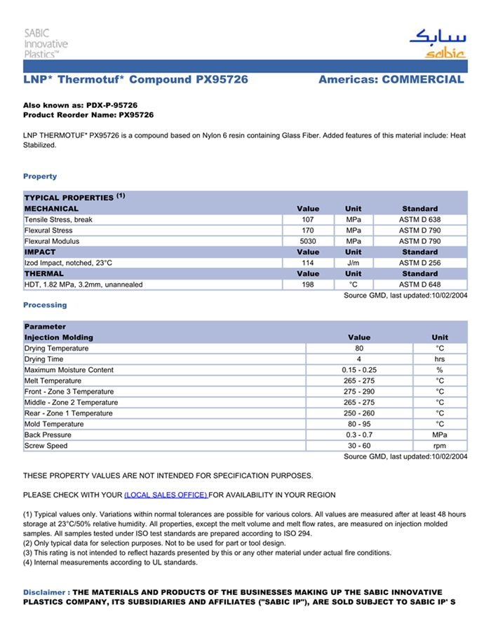 应用范围: 产品描述 LNP Thermotuf PX95726物性表 “LNP THERMOTUF PX95726是一种聚酰胺6(尼龙6)产品,含有的填充物为玻璃纤维增强材料,可以通过注射成型进行加工。 主要特性为:热稳定剂。” LNP THERMOTUF* PX95726 is a compound based on Nylon 6 resin containing Glass Fiber.