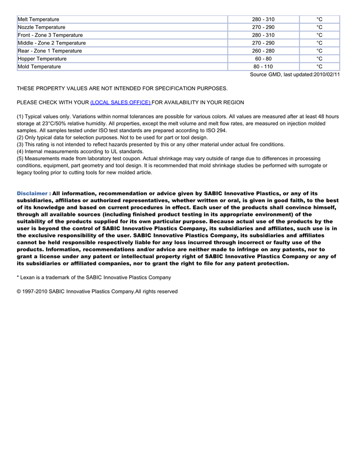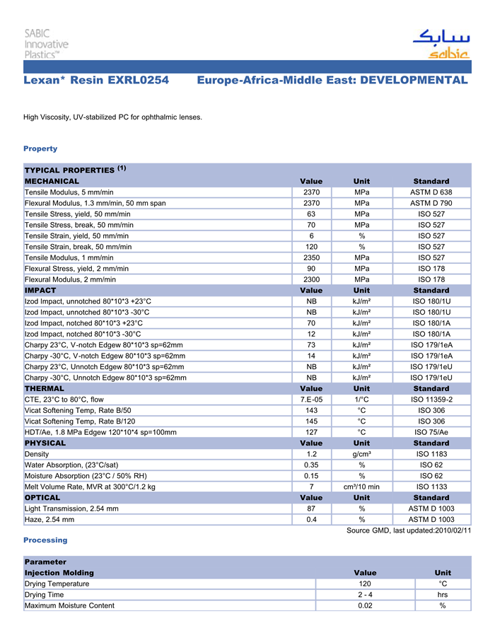 应用范围:产品描述LEXAN PC EXRL0254物性表High Viscosity, UV-stabilized PC for ophthalmic lenses.
