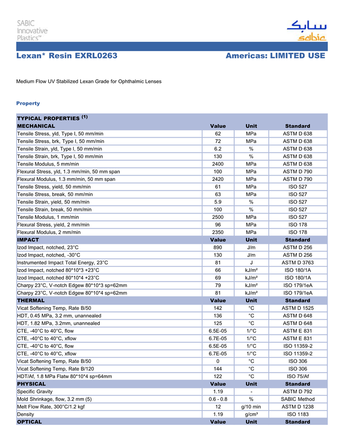 应用范围:产品描述LEXAN PC EXRL0263物性表Medium Flow UV Stabilized Lexan Grade for Ophthalmic Lenses