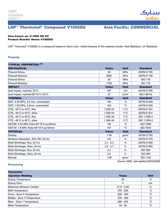 肇庆LNP THERMOTUF V1000SU是一种聚酰胺材料,加工方式为:注射成型。