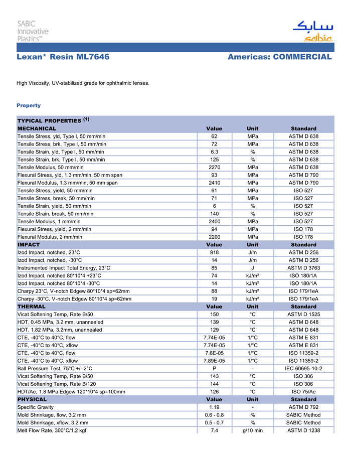 应用范围:产品描述LEXAN PC ML7646物性表High Viscosity, UV-stabilized grade for ophthalmic lenses.