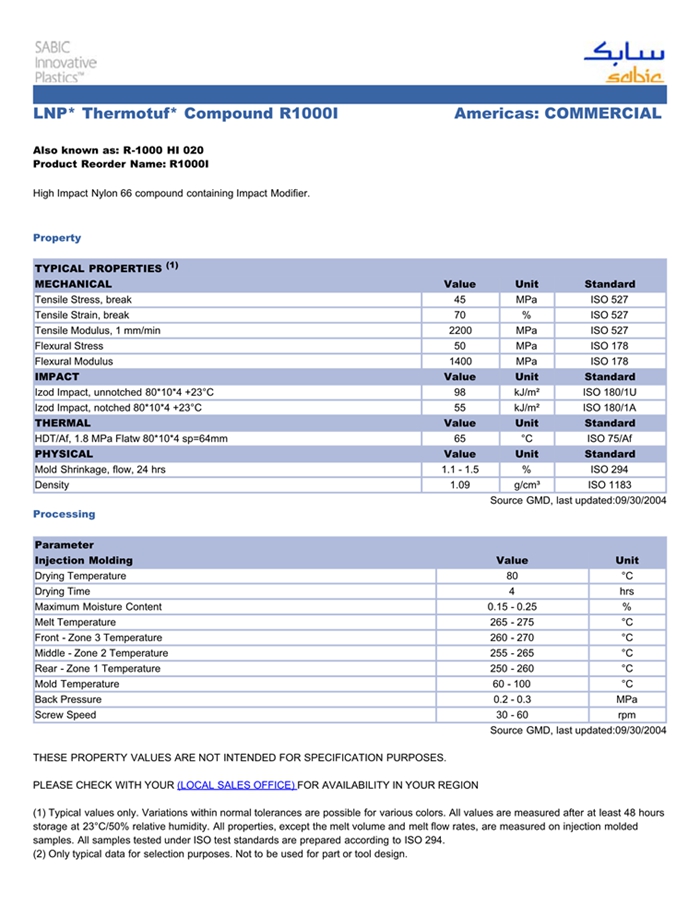 应用范围: 产品描述 LNP Thermotuf R1000I物性表 “LNP THERMOTUF R1000I是一种聚酰胺66(尼龙66)材料,加工方式为:注射成型。 LNP THERMOTUF R1000I的主要特性有: 冲击改性 耐冲击” High Impact Nylon 66 compound containing Impact Modifier. Property/特性