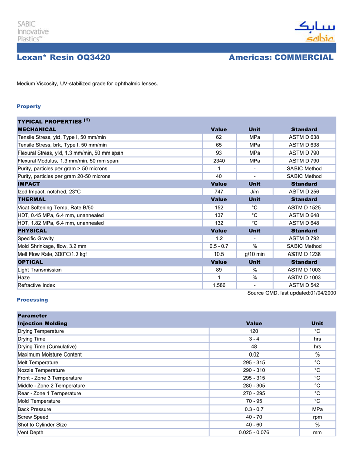 应用范围:产品描述Lexan PC OQ3420物性表中等粘度、紫外稳定牌号。 眼科用镜片。Medium Viscosity, UV-stabilized grade for ophthalmic lenses.Property/特性