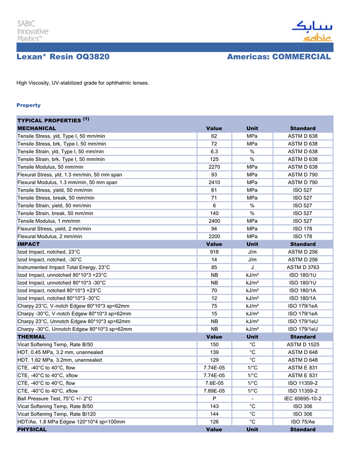 应用范围:产品描述Lexan PC OQ3820物性表高粘度、紫外稳定牌号。 眼科用镜片。相关颜色色号:OQ3820-NA1016THigh Viscosity, UV-stabilized grade for ophthalmic lenses.Property/特性