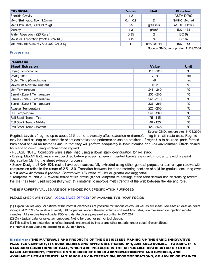 Lexan EXL1036 resin是一种聚碳酸酯(PC)材料,加工方式为:片材挤出成型。