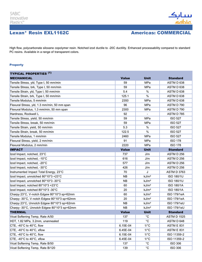 应用范围:产品描述LEXAN PC EXL1162C物性表High flow, polycarbonate siloxane copolymer resin. Notched izod ductile to -20C ductility. Enhanced processability compared to standard PC resins. Available in a range of trans